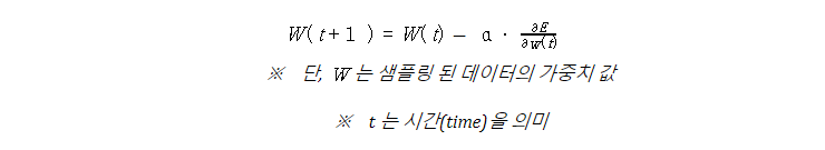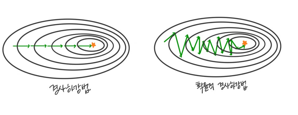 그림에서 보듯 경사 하강법은 천천히 자료를 전부 검토해서 방향을 찾아가는데 반해 확률적 경사 하강법은 랜덤한 일부데이터를 가지고 빠르게 방향을 찾아간다. 수식은 기존의 경사 하강법과 다르지 않지만 가중치는 샘플링 된 데이터의 가중치라는 점을 잊지 말자.