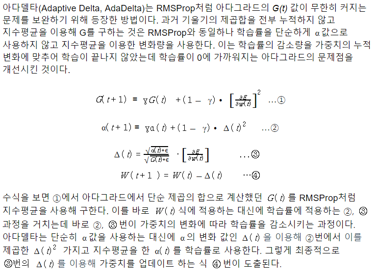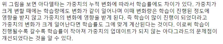 “아다그라드, 아직 갈 길이 먼데 보폭이 점점 작아지네? 가중치의 변화량을 고려해서 학습률을 변화시키자!”
