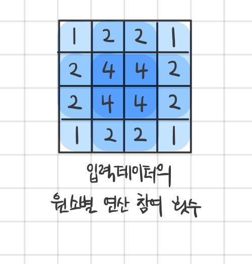 위 그림을 보면 양 끝 모서리에 위치한 원소의 연산 참여도가 가운데 위치한 원소에 비해 낮다는 것을 알 수 있다. 이는 가장자리의 정보가 다른 곳에 비해 과소평가 되었다는 것을 의미한다. 이 차이는 신경망이 깊어져 합성곱 연산이 반복된다면 더 커지게 될 것이다. 그렇다면 원본 데이터의 모든 원소가 같은 비율로 연산에 참여하게 하려면 어떻게 해야할까?