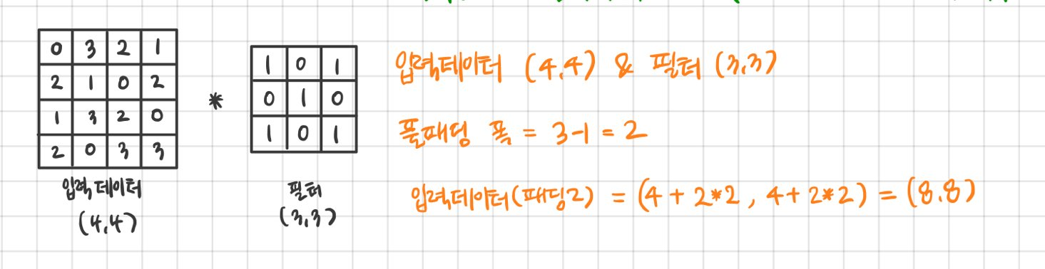 풀패딩에서 패딩의 폭이 2 pixel로 도출된 과정을 설명해 보자면 입력데이터 (Hi,Wi) 와 필터 (F, F)가 있을때 풀 패딩의 폭 P는 F-1이 된다. 그러므로 풀패딩을 적용한 입력데이터의 크기는 (Hi+2*P, Wi+2*P)가 되는 것이다. 예시를 통해 실제 값을 계산해보자.