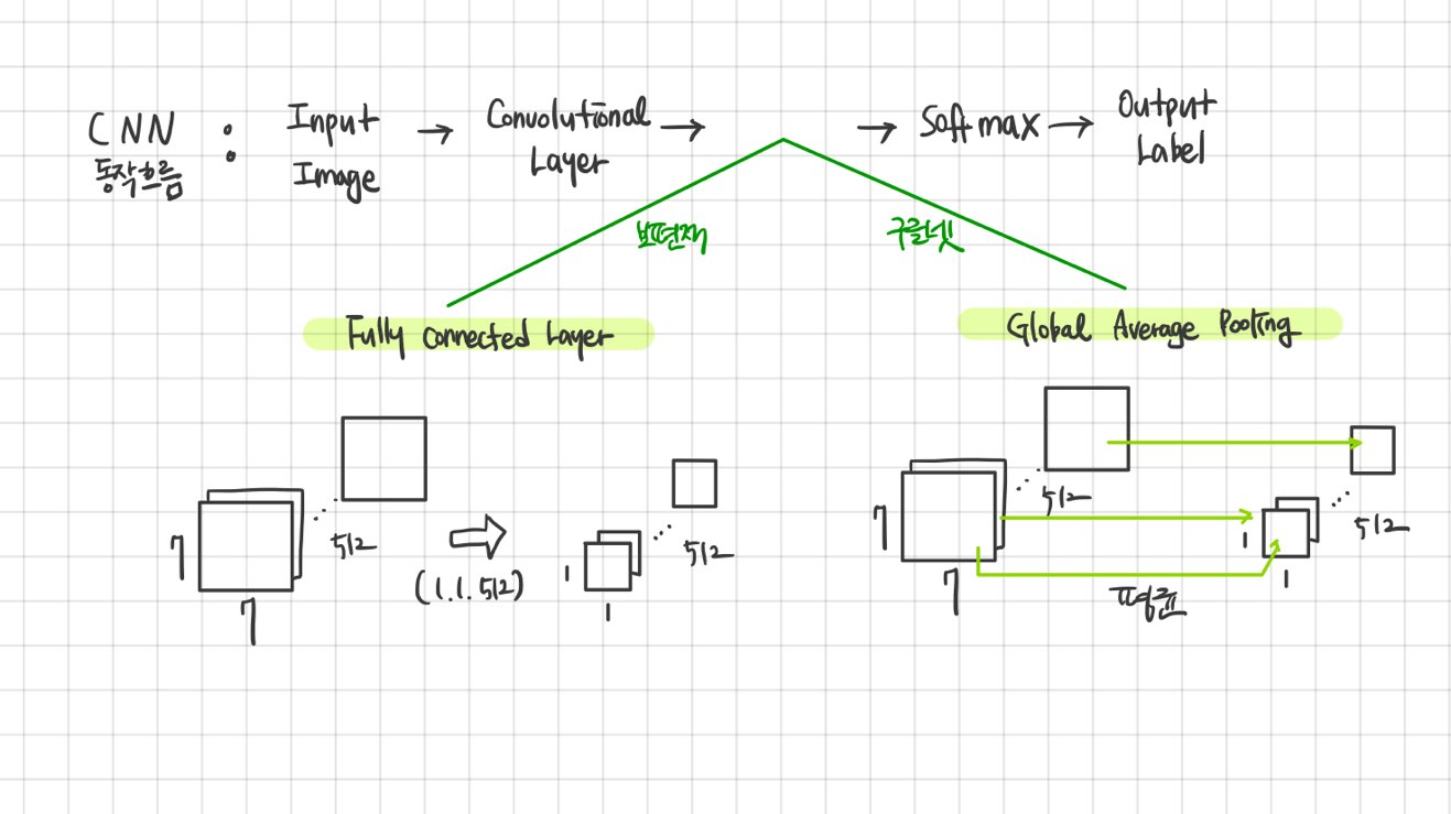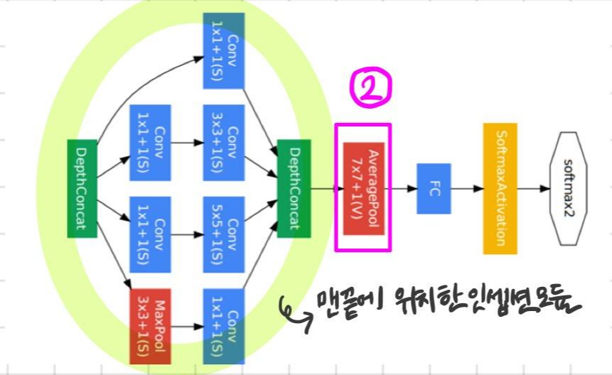 두번째로 소개할 구글넷의 특징은 출력층에서 나타나며 ②번으로 표시된 분홍색 상자이다. 일반적으로 출력층 직전에 완전 연결 층(fully connected layer)을 배치하여 마지막 피처맵을 일렬로 펼친 뒤 소트프 맥스를 이용해 분류한다. 그런데 구글넷에서는 완전 연결 층 대신에 평균 풀링을 사용하여 피처맵을 벡터화 하여 소프트맥스 처리를 한다.