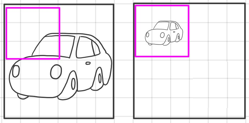 (a)를 보면 이전 층의 출력을 입력으로 받아 합성곱과 풀링을 한 후 이를 이어붙인다(concat). 동작만 보면 기존의 CNN과 비슷하지만 여기서 등장하는 구글넷의 특징은 한번에 여러 종류의 필터를 같이 사용한다는 것이다. 한번에 한 종류의 필터만 사용하는 CNN과 다르게 구글넷은 (1,1), (3,3), (5,5)의 크기가 다른 세가지 필터를 병렬로 사용한다. 이 점이 무슨 차이를 가져올지 예시를 들어보겠다. 아래에 자동차가 있는 두 이미지가 있다. 여기에 (3,3) 크기의 필터를 하나만 사용해 이미지의 특징을 찾는다고 해보자. 그림에서도 볼 수 있듯이 같은 물체일지라도 서로 다른 비율로 위치할 경우 한 종류의 필터를 사용하는 것이 효율적이지 않다는 것을 생각할 수 있다.