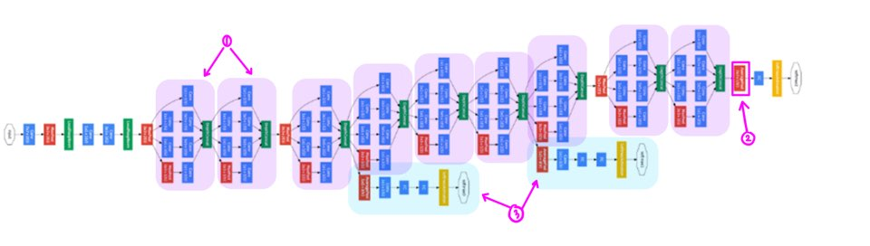 구조도와 함께 구글넷의 특징을 몇가지 살펴 보도록 하겠다. 그림에서 표시된 세개의 부분 중 첫번째 1번이라고 표시된 보라색 상자 부분을 보자.