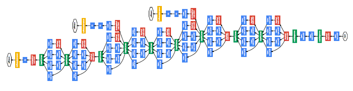 구글넷은 2014년 이미지넷 인식 대회(ILSVRC14)에서 VGG를 이기고 우승한 알고리즘이다. 구글넷은 신경망 내부 컴퓨터 자원의 활용을 높이기 위해 계산량을 일정하게 유지하면서 신경망의 깊이와 폭을 늘릴 수 있도록 설계되었다. 구글넷의 전체적인 구조는 다음의 그림과 같다.