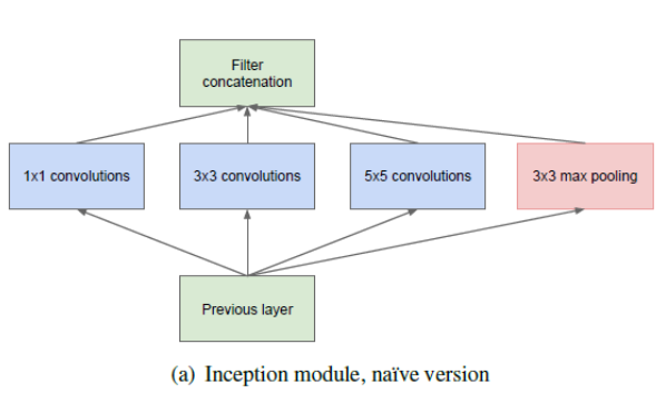 구조도에서 보라색 상자로 색칠되어 있는 부분을 보자. 마치 작은 신경망을 연상케 하는 모듈들이 연결되어 있다. 구글넷에서는 이렇게 신경망안에 또 다른 신경망이 있는 일명 ‘인셉션 구조(inception architecture)’를 제안했고 이 작은 보라색 상자를 인셉션 모듈이라고 한다. 인셉션 모듈을 확대해서보면 아래의 그림 중 오른쪽에 위치한 (b)가 된다. 그 전에 설명을 위해 먼저 (a)를 보겠다.